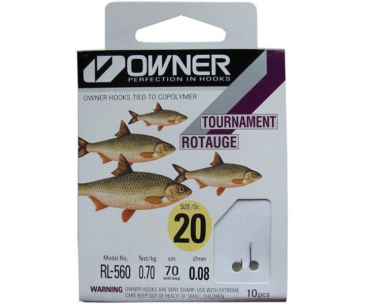 Серия крючков с поводками Owner RL-560 предназначена для ловли белой рыбы поплавочными и донными снастями. Длина поводка составляет 70 см. Размеры крючков Owner Tournament Rotauge в этой серии изменяются от 20 до 10 номера. Аналогично размеру крючка изменяется и диаметр поводка (от 0,08 до 0,14 мм). И если самые маленькие крючки на тонкой леске предназначены для ловли мелкой рыбы, то крупные крючки с прочной леской легко справятся с трофейными экземплярами. Наличие петельки позволяет осуществлять мгновенный монтаж. Крючки этой серии имеют стойкое белое покрытие.